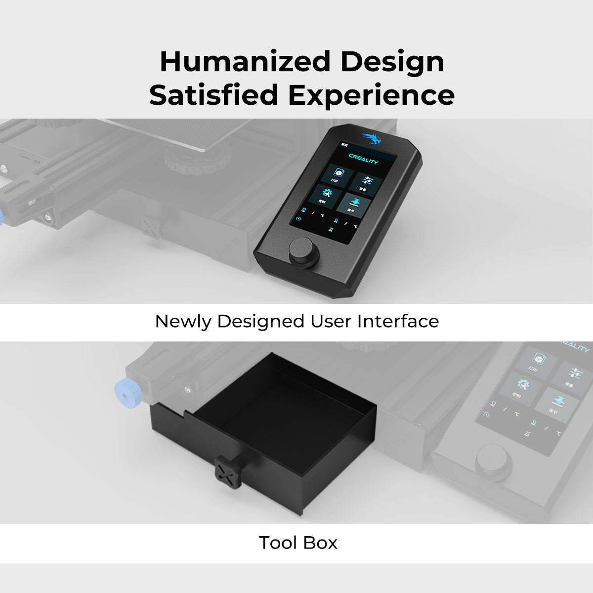 Convenient Maintenance: Features built-in rotary knobs for the X and Y-axis belt tensioners and a dedicated toolbox integrated into the machine base for storing nozzles and tools.